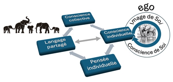 Le langage verbal et paraverbal, partagé puis consciemment construit, transmis et enrichi de générations en générations sert de support à la pensée individuelle, qui l’enrichit en retour. Cet échange permet l’émergence d’une Conscience Individuelle et Collective, cette dernière étant associée à une culture et a ses mythes (contes et légendes, rites, religions).