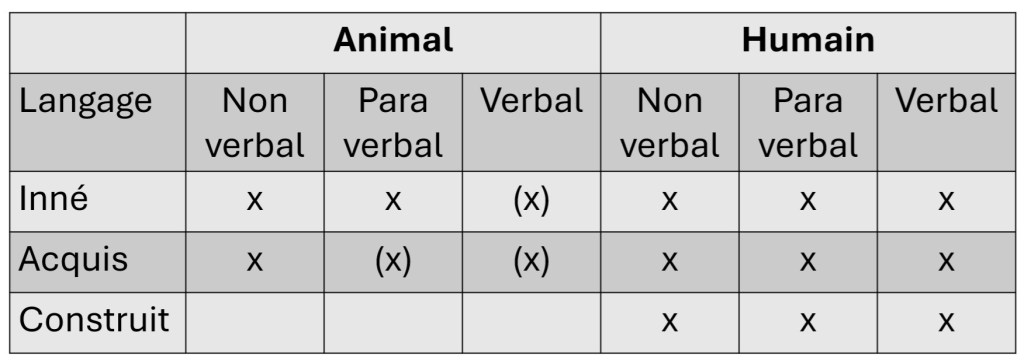Parts respectives de langages innés, acquis et construits, non verbaux (postures), para verbaux (intonations) et verbaux (vocabulaire), chez l’animal et l’humain.